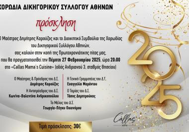 Με μεγάλη χαρά ο Μαέστρος μας, Δημήτρης Καρούζος και τα μέλη του Διοικητικού Συμβουλίου της Χορωδίας του Δικηγορικού Συλλόγου Αθηνών, σας προσκαλούν στην κοπή της Πρωτοχρονιάτικης πίτας, που θα πραγματοποιηθεί, την Πέμπτη 27 Φεβρουαρίου 2025, ώρα 20.30, στο ζεστό χώρο του «Callas Mama’s Cuisine», επί της οδού Ανδριανού 3 (σταθμός Θησείου).